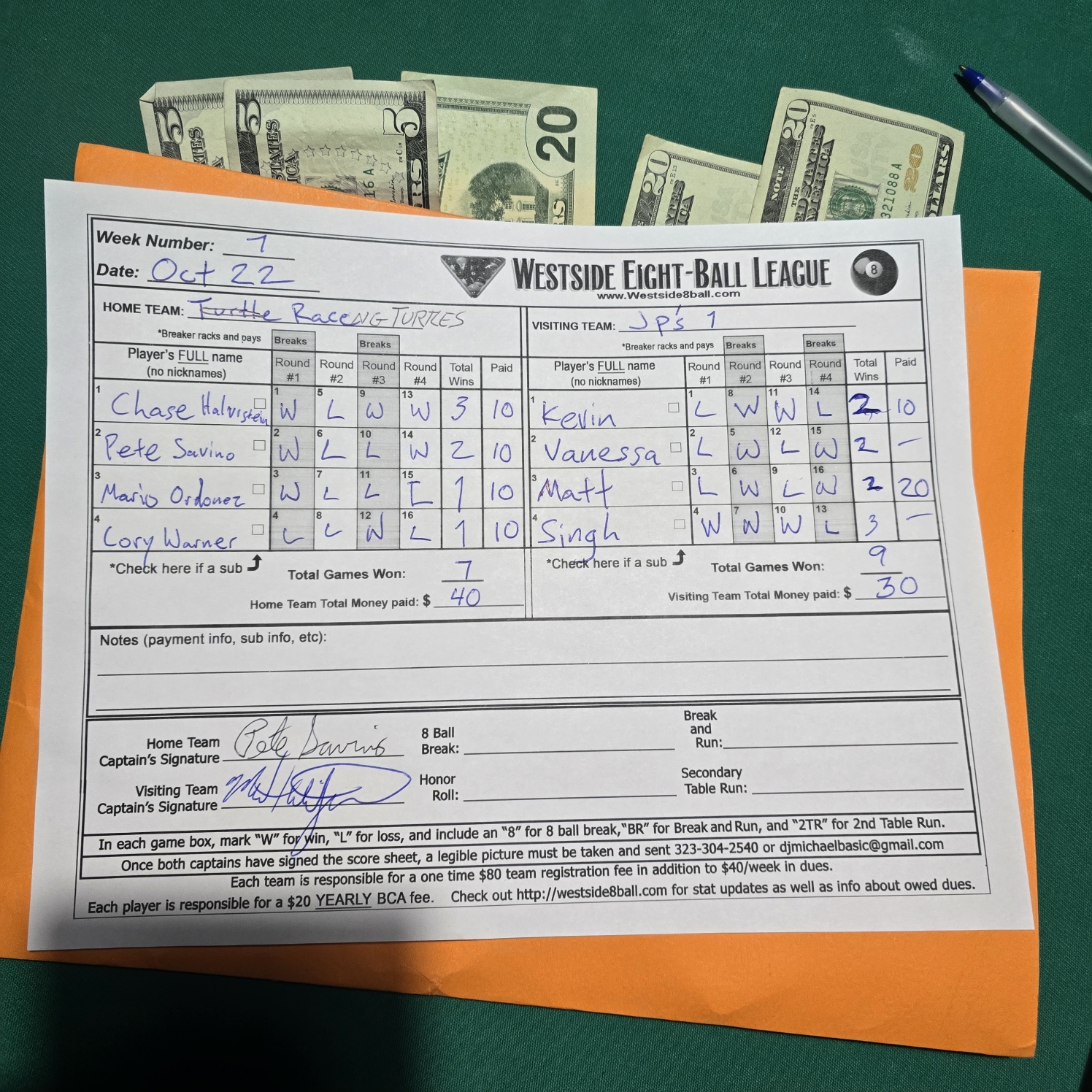 | Team | Won | Lost | 8B | TR | STR | HR | Win % | Dues Paid |